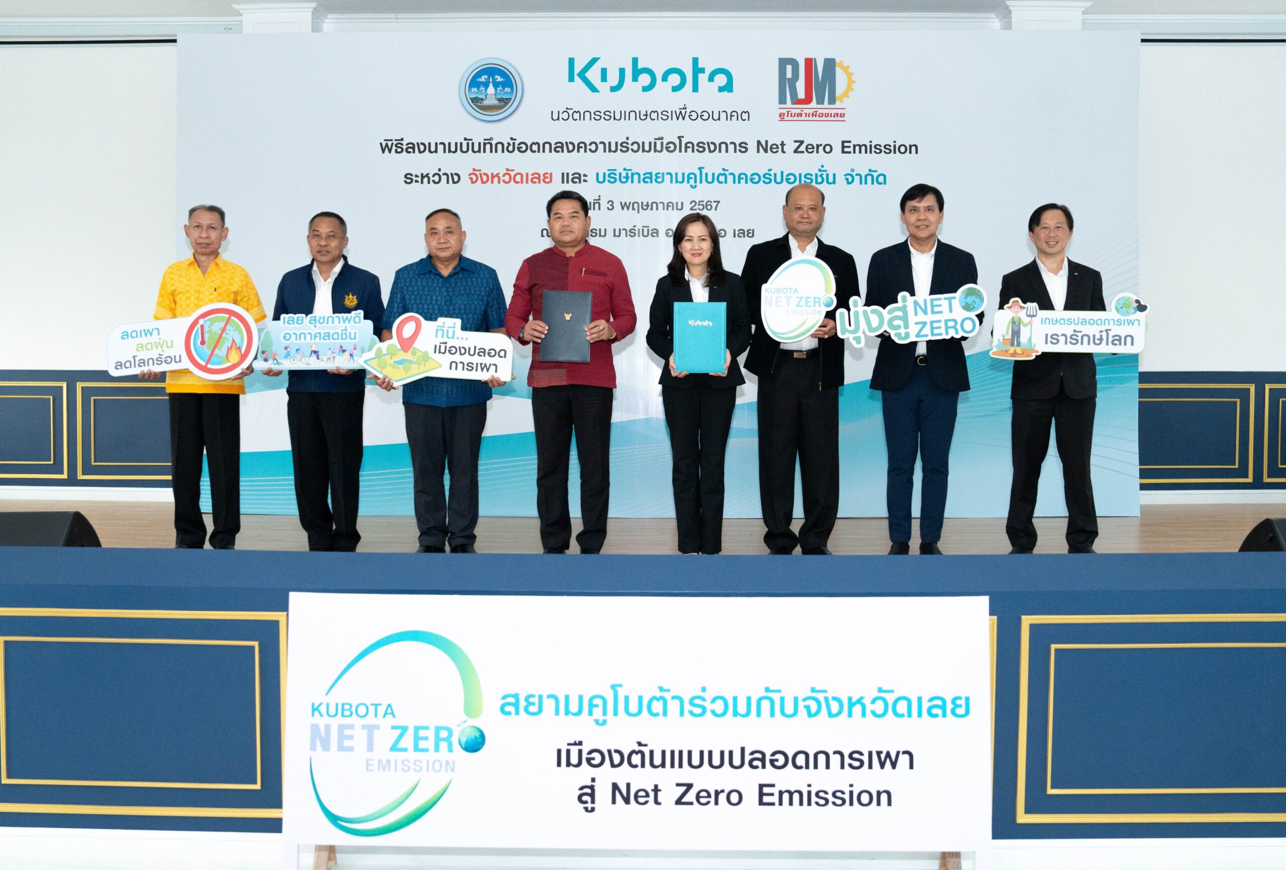 สยามคูโบต้า โดย คุณวราภรณ์ โอสถาพันธุ์ กรรมการรองผู้จัดการใหญ่อาวุโส ลงนามบันทึกข้อตกลงความร่วมมือดำเนินโครงการ Net Zero Emission ร่วมกับจังหวัดเลย โดย คุณอนุพงษ์ คำภูแก้วรองผู้ว่าราชการจังหวัดเลย เพื่อสร้างโมเดล “เมืองเลย เมืองต้นแบบปลอดการเผาสู่ Net Zero Emission” ซึ่งเป็นจังหวัดที่ 11 ที่สยามคูโบต้านำองค์ความรู้ KUBOTA (Agri) Solutions เกษตรครบวงจรเอกลักษณ์เฉพาะของคูโบต้ามาช่วยแก้ปัญหามลพิษจากฝุ่นละอองในภาคการเกษตร ตลอดจนบริหารจัดการวัสดุเหลือใช้ทางการเกษตร พร้อมตั้งเป้าลดการเผาให้เป็นศูนย์เพื่อสนับสนุนเป้าหมายการปล่อยก๊าซเรือนกระจกสุทธิเป็นศูนย์ภายในปี 2593 ณ โรงแรมมาร์เบิล อาร์ช เดอ เลย เมื่อวันที่ 3 พฤษภาคม 2567 ที่ผ่านมา