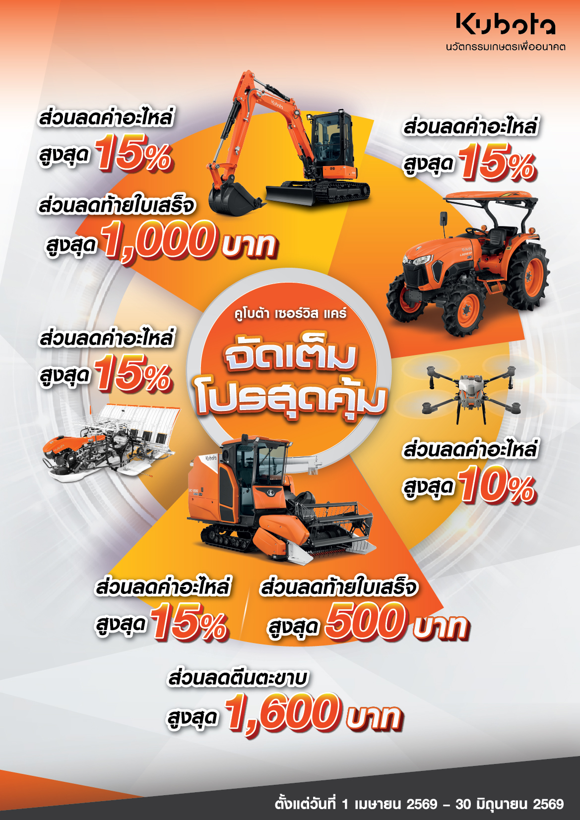 สงวนสิทธิ์การเข้ารับบริการงานซ่อมกับร้านผู้แทนจำหน่ายสินค้ารถขุดคูโบต้าทั่วประเทศ สำหรับรถขุดคูโบต้าที่พ้นระยะรับประกัน ตั้งแต่วันที่ 1 เมษายน 2569 – 30 มิถุนายน 2569 เท่านั้นและส่วนลดไม่สามารถเก็บไว้ใช้ภายหลังได้ ส่วนลดทั้งหมดในรายการส่งเสริมการขายนี้ไม่สามารถแลกเปลี่ยนหรือทอนเป็นเงินสด หรือแลกเปลี่ยนเป็นสินค้า/บริการอื่นได้ และส่วนลดโปรโมชันโครงการคูโบต้าเซอร์วิสแคร์ไม่สามารถใช้ร่วมกับโปรโมชันขายปลีกหน้าร้านได้